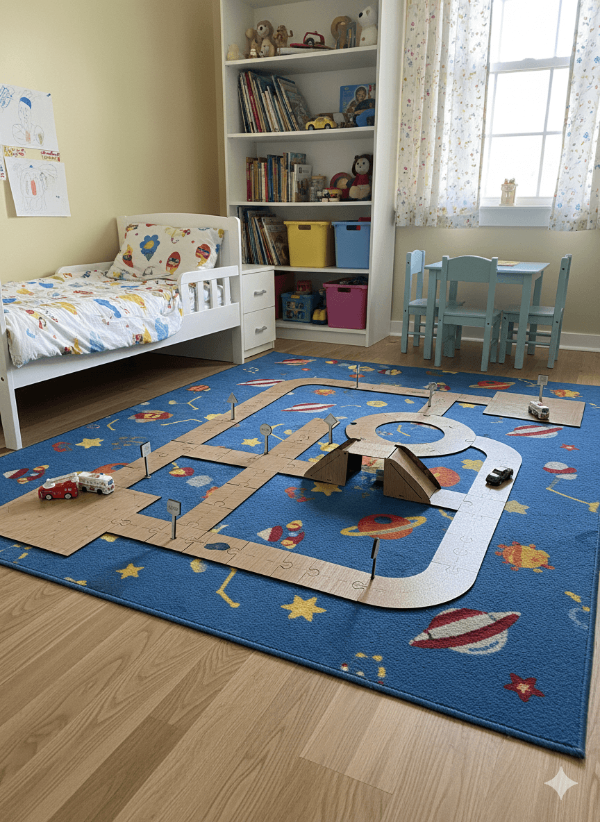 الطفل يتبع حركة السيارات على المسار ويتعلم يخطط كيفاش يلعب — وهذا يقوّي التركيز والتفكير المنطقي.