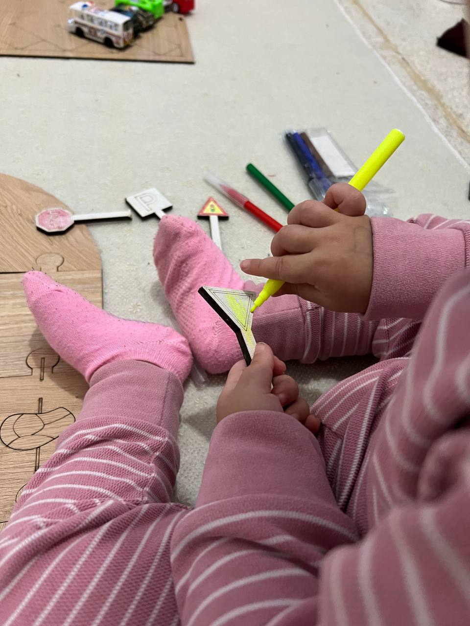 لعبة مسار السيارات الخشبي5 سيارات و اقلام التلوين مجانا!