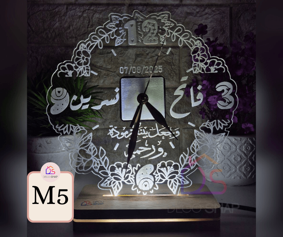 مصباح مصمّم خصيصًا ليكون قطعة فنية رومانسية، يزيّن غرفة الزوجين ويوثّق أجمل ذكرى بأضواء دافئة وساعة ذهبية راقية.
